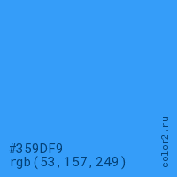 Цвет #359DF9 в цветовой модели RGB обозначается тремя октетами (53, 157, 249) в десятичном формате и #359DF9 в шестнадцатиричном (hex) формате, которые являются интенсивностью красного 53 (hex 35), интенсивность зелёного 157 (hex 9D) и интенсивность синего 249 (hex F9).