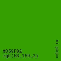 Цвет #359F02 в цветовой модели RGB обозначается тремя октетами (53, 159, 2) в десятичном формате и #359F02 в шестнадцатиричном (hex) формате, которые являются интенсивностью красного 53 (hex 35), интенсивность зелёного 159 (hex 9F) и интенсивность синего 2 (hex 02).