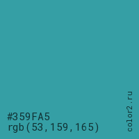 Цвет #359FA5 в цветовой модели RGB обозначается тремя октетами (53, 159, 165) в десятичном формате и #359FA5 в шестнадцатиричном (hex) формате, которые являются интенсивностью красного 53 (hex 35), интенсивность зелёного 159 (hex 9F) и интенсивность синего 165 (hex A5).