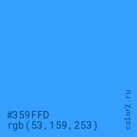 Цвет #359FFD в цветовой модели RGB обозначается тремя октетами (53, 159, 253) в десятичном формате и #359FFD в шестнадцатиричном (hex) формате, которые являются интенсивностью красного 53 (hex 35), интенсивность зелёного 159 (hex 9F) и интенсивность синего 253 (hex FD).