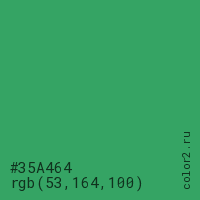 Цвет #35A464 в цветовой модели RGB обозначается тремя октетами (53, 164, 100) в десятичном формате и #35A464 в шестнадцатиричном (hex) формате, которые являются интенсивностью красного 53 (hex 35), интенсивность зелёного 164 (hex A4) и интенсивность синего 100 (hex 64).