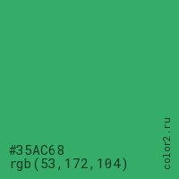 Цвет #35AC68 в цветовой модели RGB обозначается тремя октетами (53, 172, 104) в десятичном формате и #35AC68 в шестнадцатиричном (hex) формате, которые являются интенсивностью красного 53 (hex 35), интенсивность зелёного 172 (hex AC) и интенсивность синего 104 (hex 68).