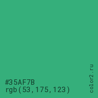 Цвет #35AF7B в цветовой модели RGB обозначается тремя октетами (53, 175, 123) в десятичном формате и #35AF7B в шестнадцатиричном (hex) формате, которые являются интенсивностью красного 53 (hex 35), интенсивность зелёного 175 (hex AF) и интенсивность синего 123 (hex 7B).