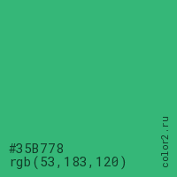 Цвет #35B778 в цветовой модели RGB обозначается тремя октетами (53, 183, 120) в десятичном формате и #35B778 в шестнадцатиричном (hex) формате, которые являются интенсивностью красного 53 (hex 35), интенсивность зелёного 183 (hex B7) и интенсивность синего 120 (hex 78).