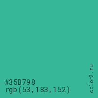 Цвет #35B798 в цветовой модели RGB обозначается тремя октетами (53, 183, 152) в десятичном формате и #35B798 в шестнадцатиричном (hex) формате, которые являются интенсивностью красного 53 (hex 35), интенсивность зелёного 183 (hex B7) и интенсивность синего 152 (hex 98).