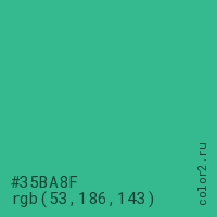 Цвет #35BA8F в цветовой модели RGB обозначается тремя октетами (53, 186, 143) в десятичном формате и #35BA8F в шестнадцатиричном (hex) формате, которые являются интенсивностью красного 53 (hex 35), интенсивность зелёного 186 (hex BA) и интенсивность синего 143 (hex 8F).