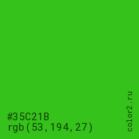 Цвет #35C21B в цветовой модели RGB обозначается тремя октетами (53, 194, 27) в десятичном формате и #35C21B в шестнадцатиричном (hex) формате, которые являются интенсивностью красного 53 (hex 35), интенсивность зелёного 194 (hex C2) и интенсивность синего 27 (hex 1B).