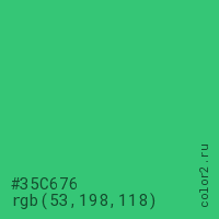 Цвет #35C676 в цветовой модели RGB обозначается тремя октетами (53, 198, 118) в десятичном формате и #35C676 в шестнадцатиричном (hex) формате, которые являются интенсивностью красного 53 (hex 35), интенсивность зелёного 198 (hex C6) и интенсивность синего 118 (hex 76).