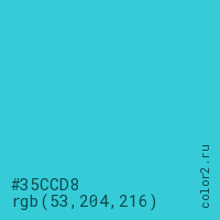 Цвет #35CCD8 в цветовой модели RGB обозначается тремя октетами (53, 204, 216) в десятичном формате и #35CCD8 в шестнадцатиричном (hex) формате, которые являются интенсивностью красного 53 (hex 35), интенсивность зелёного 204 (hex CC) и интенсивность синего 216 (hex D8).