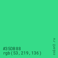 Цвет #35DB88 в цветовой модели RGB обозначается тремя октетами (53, 219, 136) в десятичном формате и #35DB88 в шестнадцатиричном (hex) формате, которые являются интенсивностью красного 53 (hex 35), интенсивность зелёного 219 (hex DB) и интенсивность синего 136 (hex 88).