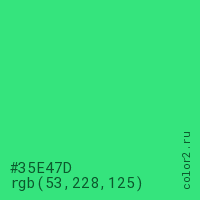 Цвет #35E47D в цветовой модели RGB обозначается тремя октетами (53, 228, 125) в десятичном формате и #35E47D в шестнадцатиричном (hex) формате, которые являются интенсивностью красного 53 (hex 35), интенсивность зелёного 228 (hex E4) и интенсивность синего 125 (hex 7D).