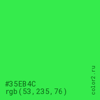 Цвет #35EB4C в цветовой модели RGB обозначается тремя октетами (53, 235, 76) в десятичном формате и #35EB4C в шестнадцатиричном (hex) формате, которые являются интенсивностью красного 53 (hex 35), интенсивность зелёного 235 (hex EB) и интенсивность синего 76 (hex 4C).