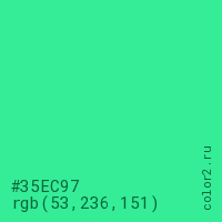 Цвет #35EC97 в цветовой модели RGB обозначается тремя октетами (53, 236, 151) в десятичном формате и #35EC97 в шестнадцатиричном (hex) формате, которые являются интенсивностью красного 53 (hex 35), интенсивность зелёного 236 (hex EC) и интенсивность синего 151 (hex 97).