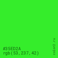 Цвет #35ED2A в цветовой модели RGB обозначается тремя октетами (53, 237, 42) в десятичном формате и #35ED2A в шестнадцатиричном (hex) формате, которые являются интенсивностью красного 53 (hex 35), интенсивность зелёного 237 (hex ED) и интенсивность синего 42 (hex 2A).