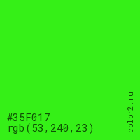 Цвет #35F017 в цветовой модели RGB обозначается тремя октетами (53, 240, 23) в десятичном формате и #35F017 в шестнадцатиричном (hex) формате, которые являются интенсивностью красного 53 (hex 35), интенсивность зелёного 240 (hex F0) и интенсивность синего 23 (hex 17).