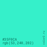 Цвет #35F0CA в цветовой модели RGB обозначается тремя октетами (53, 240, 202) в десятичном формате и #35F0CA в шестнадцатиричном (hex) формате, которые являются интенсивностью красного 53 (hex 35), интенсивность зелёного 240 (hex F0) и интенсивность синего 202 (hex CA).