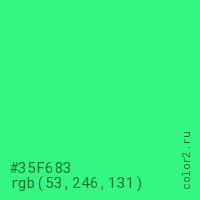 Цвет #35F683 в цветовой модели RGB обозначается тремя октетами (53, 246, 131) в десятичном формате и #35F683 в шестнадцатиричном (hex) формате, которые являются интенсивностью красного 53 (hex 35), интенсивность зелёного 246 (hex F6) и интенсивность синего 131 (hex 83).