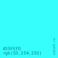 Цвет #35FEFD в цветовой модели RGB обозначается тремя октетами (53, 254, 253) в десятичном формате и #35FEFD в шестнадцатиричном (hex) формате, которые являются интенсивностью красного 53 (hex 35), интенсивность зелёного 254 (hex FE) и интенсивность синего 253 (hex FD).