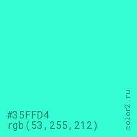 Цвет #35FFD4 в цветовой модели RGB обозначается тремя октетами (53, 255, 212) в десятичном формате и #35FFD4 в шестнадцатиричном (hex) формате, которые являются интенсивностью красного 53 (hex 35), интенсивность зелёного 255 (hex FF) и интенсивность синего 212 (hex D4).
