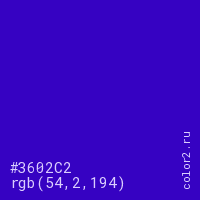 Цвет #3602C2 в цветовой модели RGB обозначается тремя октетами (54, 2, 194) в десятичном формате и #3602C2 в шестнадцатиричном (hex) формате, которые являются интенсивностью красного 54 (hex 36), интенсивность зелёного 2 (hex 02) и интенсивность синего 194 (hex C2).