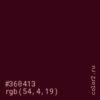 Цвет #360413 в цветовой модели RGB обозначается тремя октетами (54, 4, 19) в десятичном формате и #360413 в шестнадцатиричном (hex) формате, которые являются интенсивностью красного 54 (hex 36), интенсивность зелёного 4 (hex 04) и интенсивность синего 19 (hex 13).