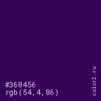 Цвет #360456 в цветовой модели RGB обозначается тремя октетами (54, 4, 86) в десятичном формате и #360456 в шестнадцатиричном (hex) формате, которые являются интенсивностью красного 54 (hex 36), интенсивность зелёного 4 (hex 04) и интенсивность синего 86 (hex 56).