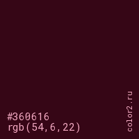 Цвет #360616 в цветовой модели RGB обозначается тремя октетами (54, 6, 22) в десятичном формате и #360616 в шестнадцатиричном (hex) формате, которые являются интенсивностью красного 54 (hex 36), интенсивность зелёного 6 (hex 06) и интенсивность синего 22 (hex 16).