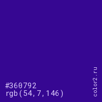 Цвет #360792 в цветовой модели RGB обозначается тремя октетами (54, 7, 146) в десятичном формате и #360792 в шестнадцатиричном (hex) формате, которые являются интенсивностью красного 54 (hex 36), интенсивность зелёного 7 (hex 07) и интенсивность синего 146 (hex 92).