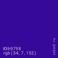 Цвет #360798 в цветовой модели RGB обозначается тремя октетами (54, 7, 152) в десятичном формате и #360798 в шестнадцатиричном (hex) формате, которые являются интенсивностью красного 54 (hex 36), интенсивность зелёного 7 (hex 07) и интенсивность синего 152 (hex 98).