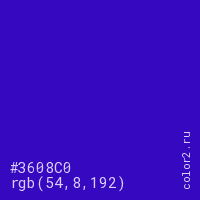 Цвет #3608C0 в цветовой модели RGB обозначается тремя октетами (54, 8, 192) в десятичном формате и #3608C0 в шестнадцатиричном (hex) формате, которые являются интенсивностью красного 54 (hex 36), интенсивность зелёного 8 (hex 08) и интенсивность синего 192 (hex C0).
