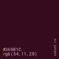Цвет #360B1C в цветовой модели RGB обозначается тремя октетами (54, 11, 28) в десятичном формате и #360B1C в шестнадцатиричном (hex) формате, которые являются интенсивностью красного 54 (hex 36), интенсивность зелёного 11 (hex 0B) и интенсивность синего 28 (hex 1C).