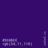 Цвет #360B6E в цветовой модели RGB обозначается тремя октетами (54, 11, 110) в десятичном формате и #360B6E в шестнадцатиричном (hex) формате, которые являются интенсивностью красного 54 (hex 36), интенсивность зелёного 11 (hex 0B) и интенсивность синего 110 (hex 6E).
