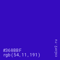Цвет #360BBF в цветовой модели RGB обозначается тремя октетами (54, 11, 191) в десятичном формате и #360BBF в шестнадцатиричном (hex) формате, которые являются интенсивностью красного 54 (hex 36), интенсивность зелёного 11 (hex 0B) и интенсивность синего 191 (hex BF).