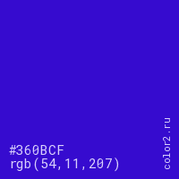 Цвет #360BCF в цветовой модели RGB обозначается тремя октетами (54, 11, 207) в десятичном формате и #360BCF в шестнадцатиричном (hex) формате, которые являются интенсивностью красного 54 (hex 36), интенсивность зелёного 11 (hex 0B) и интенсивность синего 207 (hex CF).