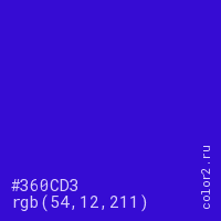 Цвет #360CD3 в цветовой модели RGB обозначается тремя октетами (54, 12, 211) в десятичном формате и #360CD3 в шестнадцатиричном (hex) формате, которые являются интенсивностью красного 54 (hex 36), интенсивность зелёного 12 (hex 0C) и интенсивность синего 211 (hex D3).