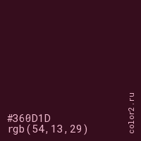 Цвет #360D1D в цветовой модели RGB обозначается тремя октетами (54, 13, 29) в десятичном формате и #360D1D в шестнадцатиричном (hex) формате, которые являются интенсивностью красного 54 (hex 36), интенсивность зелёного 13 (hex 0D) и интенсивность синего 29 (hex 1D).