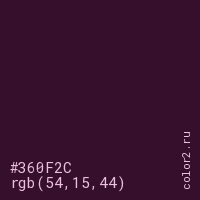 Цвет #360F2C в цветовой модели RGB обозначается тремя октетами (54, 15, 44) в десятичном формате и #360F2C в шестнадцатиричном (hex) формате, которые являются интенсивностью красного 54 (hex 36), интенсивность зелёного 15 (hex 0F) и интенсивность синего 44 (hex 2C).