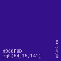 Цвет #360F8D в цветовой модели RGB обозначается тремя октетами (54, 15, 141) в десятичном формате и #360F8D в шестнадцатиричном (hex) формате, которые являются интенсивностью красного 54 (hex 36), интенсивность зелёного 15 (hex 0F) и интенсивность синего 141 (hex 8D).