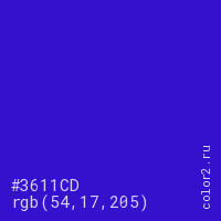 Цвет #3611CD в цветовой модели RGB обозначается тремя октетами (54, 17, 205) в десятичном формате и #3611CD в шестнадцатиричном (hex) формате, которые являются интенсивностью красного 54 (hex 36), интенсивность зелёного 17 (hex 11) и интенсивность синего 205 (hex CD).
