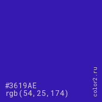 Цвет #3619AE в цветовой модели RGB обозначается тремя октетами (54, 25, 174) в десятичном формате и #3619AE в шестнадцатиричном (hex) формате, которые являются интенсивностью красного 54 (hex 36), интенсивность зелёного 25 (hex 19) и интенсивность синего 174 (hex AE).