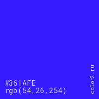 Цвет #361AFE в цветовой модели RGB обозначается тремя октетами (54, 26, 254) в десятичном формате и #361AFE в шестнадцатиричном (hex) формате, которые являются интенсивностью красного 54 (hex 36), интенсивность зелёного 26 (hex 1A) и интенсивность синего 254 (hex FE).