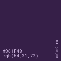 Цвет #361F48 в цветовой модели RGB обозначается тремя октетами (54, 31, 72) в десятичном формате и #361F48 в шестнадцатиричном (hex) формате, которые являются интенсивностью красного 54 (hex 36), интенсивность зелёного 31 (hex 1F) и интенсивность синего 72 (hex 48).