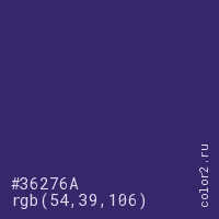 Цвет #36276A в цветовой модели RGB обозначается тремя октетами (54, 39, 106) в десятичном формате и #36276A в шестнадцатиричном (hex) формате, которые являются интенсивностью красного 54 (hex 36), интенсивность зелёного 39 (hex 27) и интенсивность синего 106 (hex 6A).