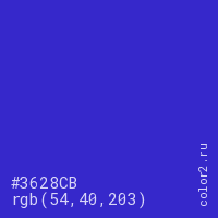 Цвет #3628CB в цветовой модели RGB обозначается тремя октетами (54, 40, 203) в десятичном формате и #3628CB в шестнадцатиричном (hex) формате, которые являются интенсивностью красного 54 (hex 36), интенсивность зелёного 40 (hex 28) и интенсивность синего 203 (hex CB).