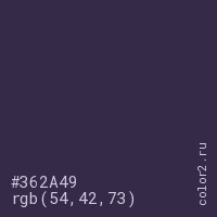 Цвет #362A49 в цветовой модели RGB обозначается тремя октетами (54, 42, 73) в десятичном формате и #362A49 в шестнадцатиричном (hex) формате, которые являются интенсивностью красного 54 (hex 36), интенсивность зелёного 42 (hex 2A) и интенсивность синего 73 (hex 49).