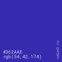 Цвет #362AAE в цветовой модели RGB обозначается тремя октетами (54, 42, 174) в десятичном формате и #362AAE в шестнадцатиричном (hex) формате, которые являются интенсивностью красного 54 (hex 36), интенсивность зелёного 42 (hex 2A) и интенсивность синего 174 (hex AE).