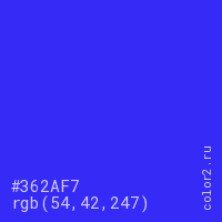 Цвет #362AF7 в цветовой модели RGB обозначается тремя октетами (54, 42, 247) в десятичном формате и #362AF7 в шестнадцатиричном (hex) формате, которые являются интенсивностью красного 54 (hex 36), интенсивность зелёного 42 (hex 2A) и интенсивность синего 247 (hex F7).