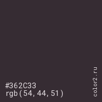 Цвет #362C33 в цветовой модели RGB обозначается тремя октетами (54, 44, 51) в десятичном формате и #362C33 в шестнадцатиричном (hex) формате, которые являются интенсивностью красного 54 (hex 36), интенсивность зелёного 44 (hex 2C) и интенсивность синего 51 (hex 33).