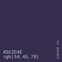 Цвет #362D4E в цветовой модели RGB обозначается тремя октетами (54, 45, 78) в десятичном формате и #362D4E в шестнадцатиричном (hex) формате, которые являются интенсивностью красного 54 (hex 36), интенсивность зелёного 45 (hex 2D) и интенсивность синего 78 (hex 4E).