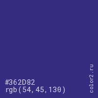 Цвет #362D82 в цветовой модели RGB обозначается тремя октетами (54, 45, 130) в десятичном формате и #362D82 в шестнадцатиричном (hex) формате, которые являются интенсивностью красного 54 (hex 36), интенсивность зелёного 45 (hex 2D) и интенсивность синего 130 (hex 82).